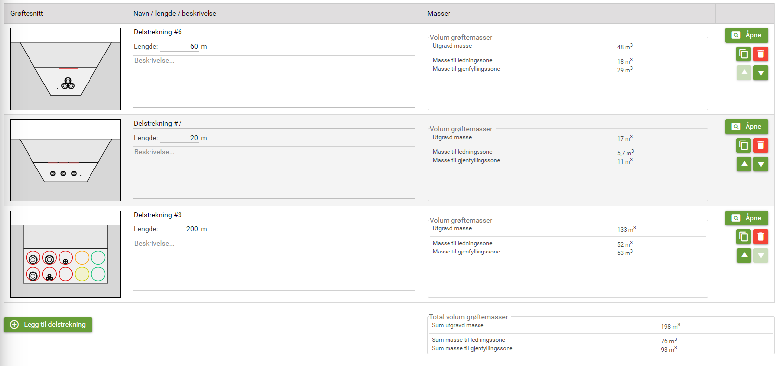 Figuren over viser et prosjekt med tre grøftesnitt. På hvert grøftesnitt legger man inn lengde og så får man gjort en masseberegning både for hver enkel delstrekning, og for hele prosjektet. I dette vinduet kan man også kopiere, flytte og slette delstrekninger.
