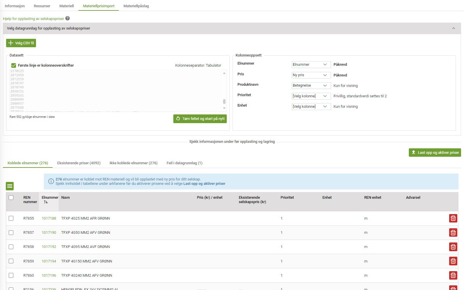 - Bestem hvilke kolonner som har elnummer og pris, dette er påkrevd