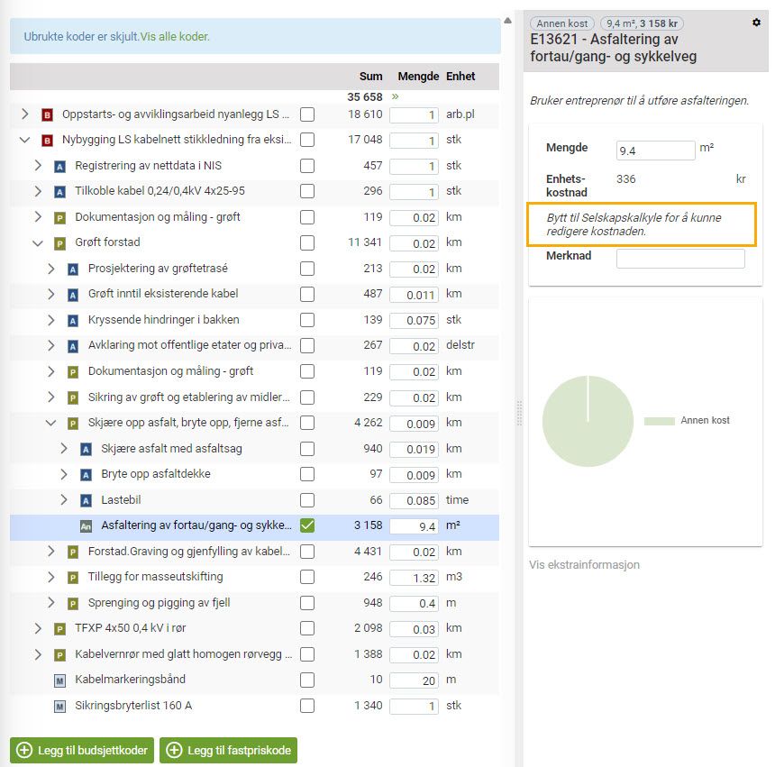 Ved bruk av selskapskalkyle, brukes deres egne ressurs- og materiellpriser i Kalkyle. Den siste typen kostnad er «Annenkost» som er en sekkepost for kostnader for eksempelerstatning og gebyrer, betong, asfaltering eller masser til grøft. Denne typen kostnad kan utgjøre en stor andel for noen prosjekter, og da er det viktig at dere som selskap kan legge inn deres egen pris. Det er nå mulig å endre enhetskostnad for «Annenkost» hvis dere bruker selskapskalkyle. Dette kan foreløpig kun gjøres pr kalkyle, og pr «Annenkost – element» i kalkylen. Bare klikk på koden, og rett prisen i informasjonsfeltet til høyre.