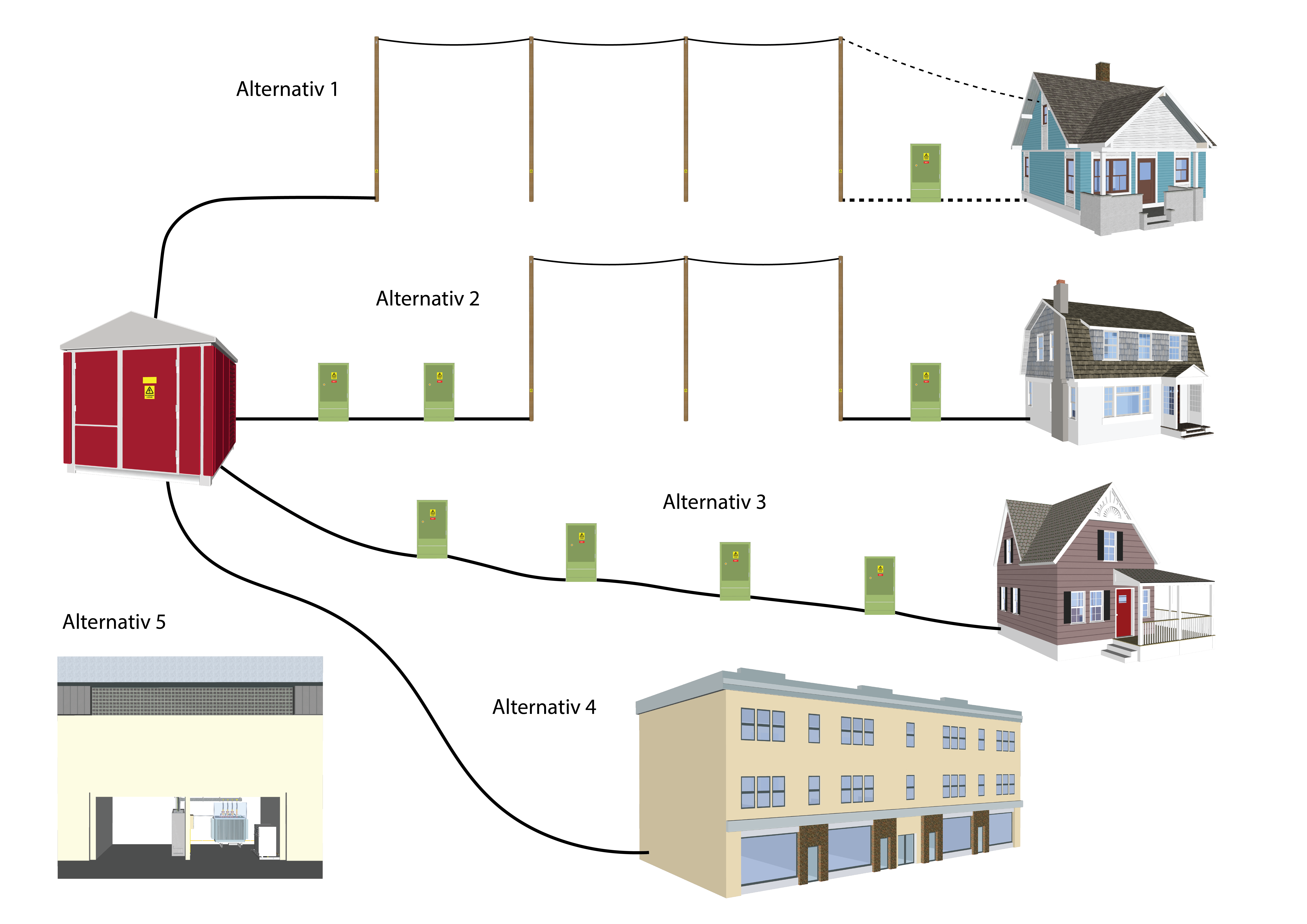 Disse vil beskrive løsninger for LS distribusjonsnett som kan anvendes for alle de ulike alternativene beskrevet i figur 1. Alt fra luftnett til rent kabelnett, samt også høyere effekter som angitt i standarden NEK 399 metode A, B og C.