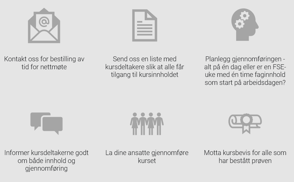Vi ønsker at hvert selskap selv kan bestemme hvordan innholdet gjennomgås; enten som én lang økt eller delt opp i flere korte økter, og om kurset kjøres enkeltvis, i grupper eller i plenum. Selvstudie av forhåndsinnspilt kursmateriale er lagt opp med ca. 4,5 timer. I tillegg kommer det 2 timer nettmøte med kursinstruktør.