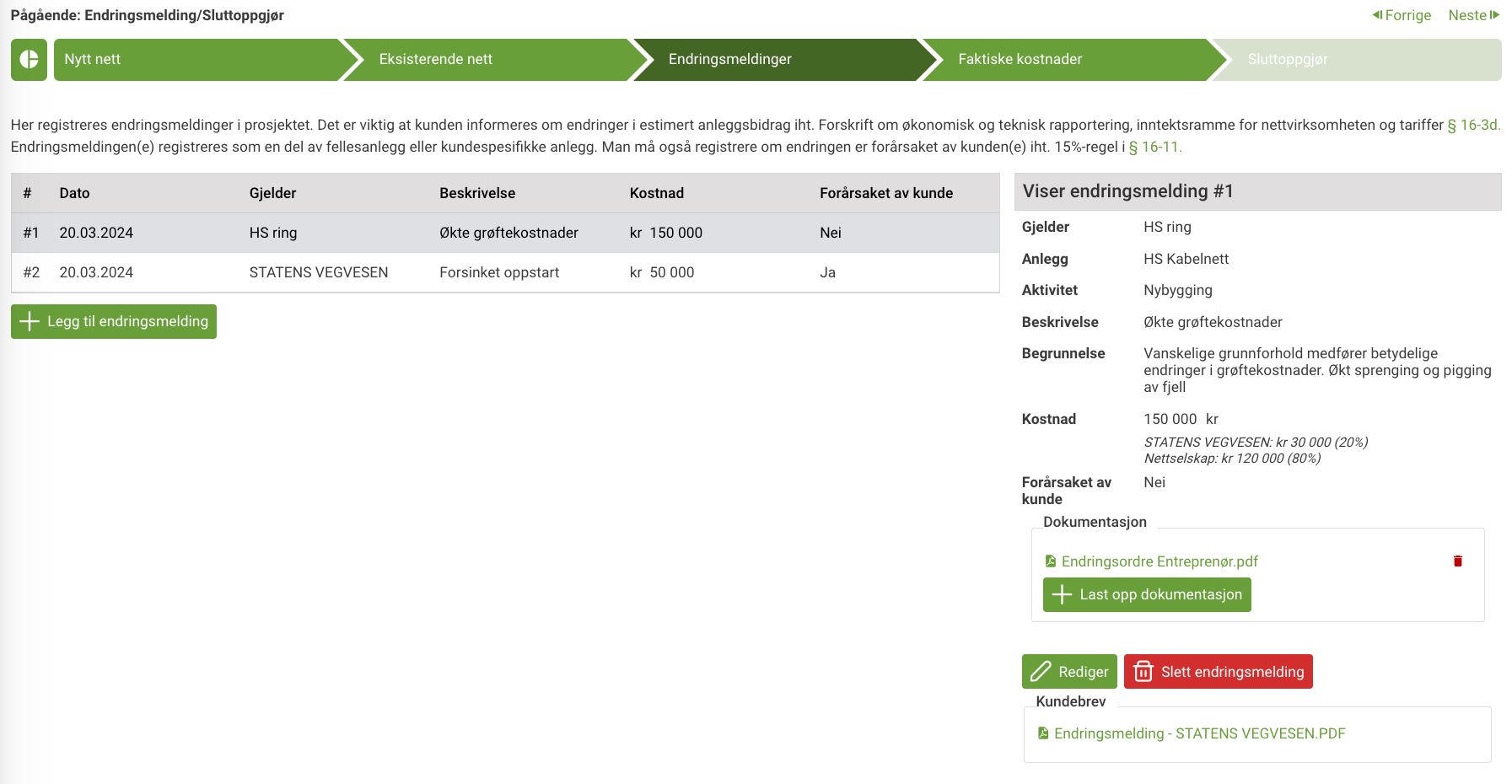 I desember omtalte vi de nye funksjonene knyttet til anleggsbidrag i regionalnett. Siden den tid har vi jobbet med bedre dokumentasjon av selve utførelsesfasen etter at kunden har akseptert anleggsbidragsavtalen. Vi erstatter derfor fasen «sluttoppgjør» med en ny fase som kalles "Endringsmelding/sluttoppgjør". Dette gir bedre dokumentasjon og kontroll på endringsmeldinger iht. kontrollforskriften § 16-3. Fasen etableres når man kommer til utførelsesfasen i prosjektet. Da dokumenterer man endringer som oppstår underveis i utførelsesfasen og legger inn faktiske kostnader for prosjektet før sluttoppgjør fullføres. Her vil man kunne dokumentere endringsmeldinger, enten det er forårsaket av kunden eller ikke. Dette er relevant med hensyn til 15 %- regelen som er beskrevet i kontrollforskriften § 16-11. For hver endringsmelding blir det generert et kundebrev som beskriver årsak til kostnadsendringen.