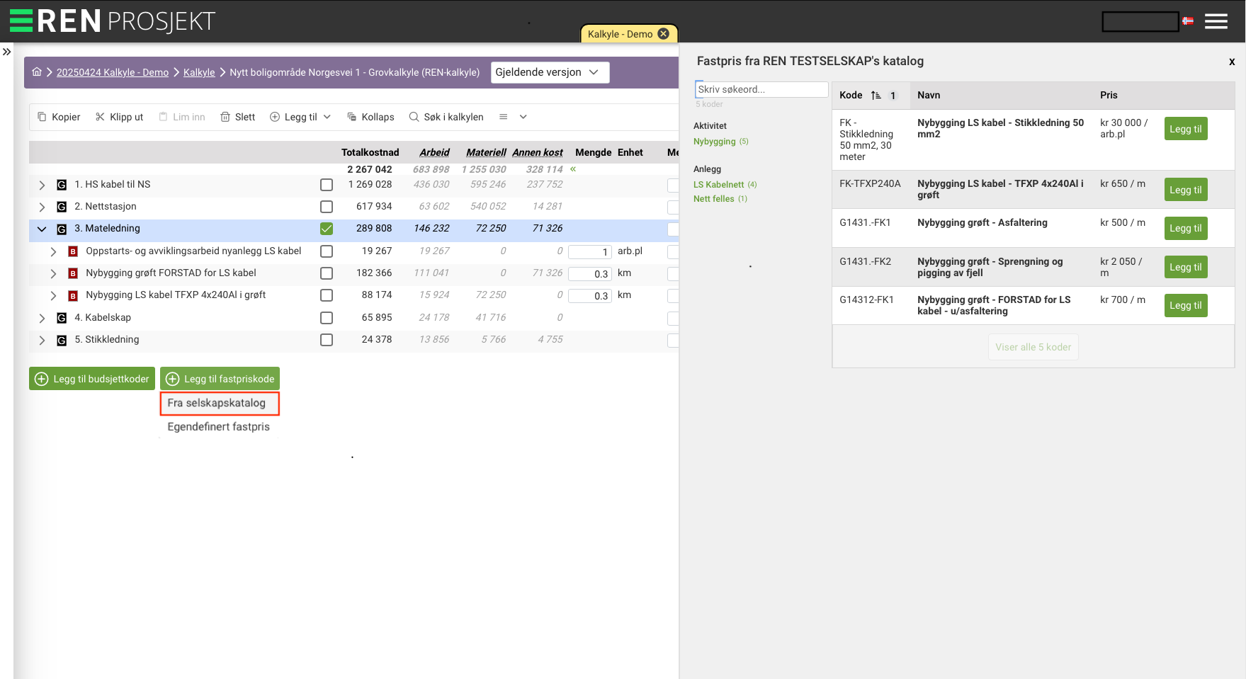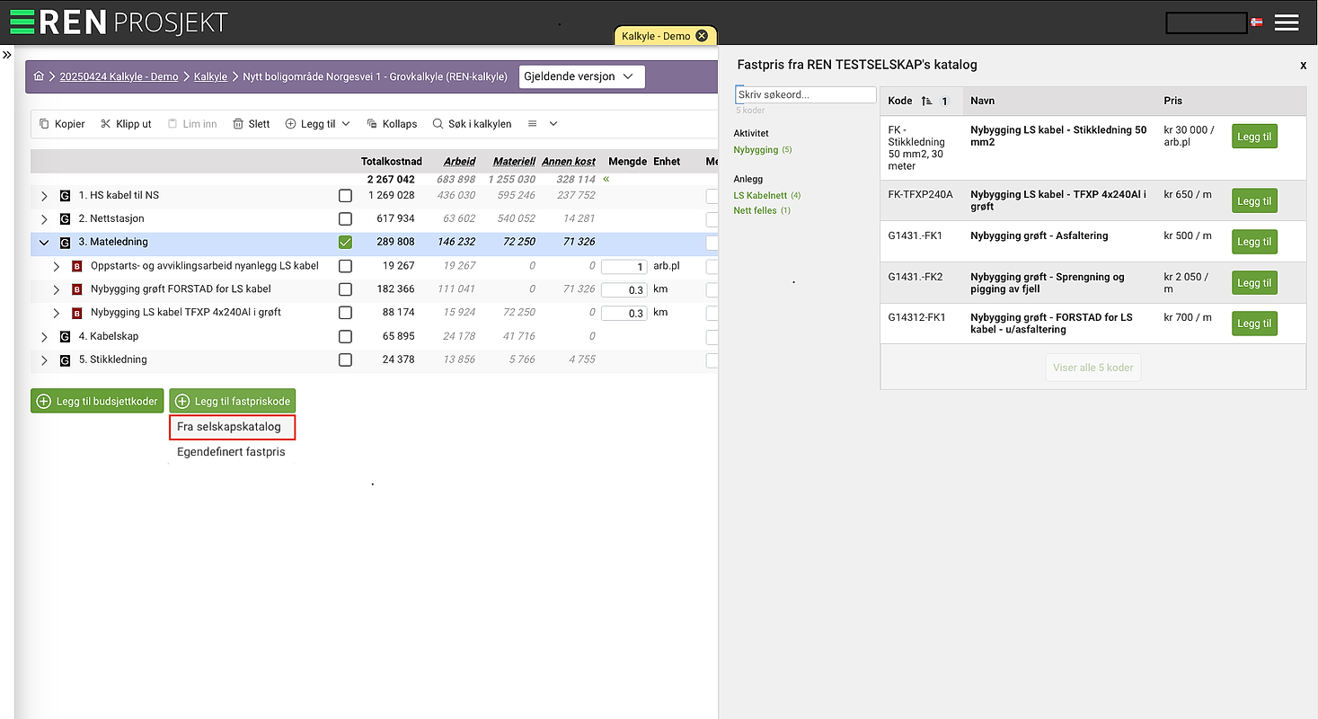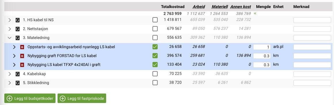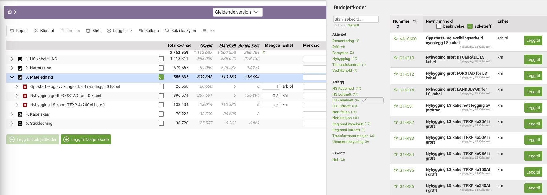 Men bør en bruke REN sine budsjettkoder på alt? Eksempelvis; for å legge en mateledning fra nettstasjon, trengs det budsjettkode for alt av arbeidet med grøften, som å fjerne asfalt, grave grøften, utskiftning av masser, og det vil være behov for en budsjettkode som inneholder materiellpris på kabel, kabelbeskyttelser, evt. skjøt, og arbeidskostnader som utdragning av kabel. Ved utklipp under ser vi budsjettkoder typisk brukt for en LS mateledning: