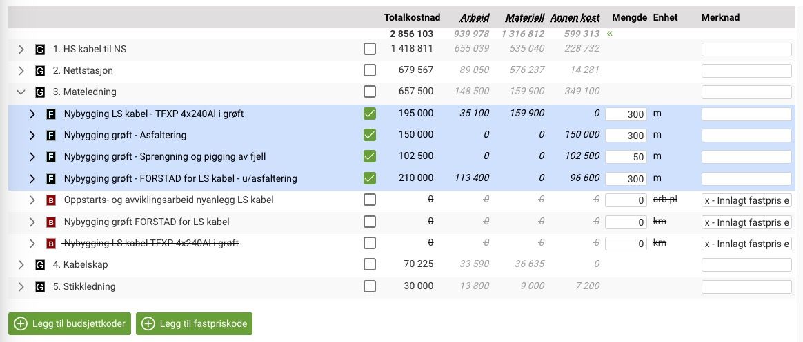 Se utklipp under. Her har vi brukt fastpriskostnader fra entreprenør (blåmarkert), som erstatter budsjettkodene (gjennomstreket).