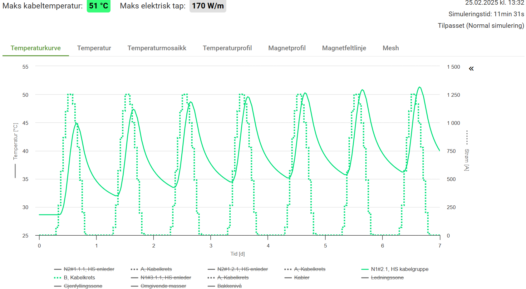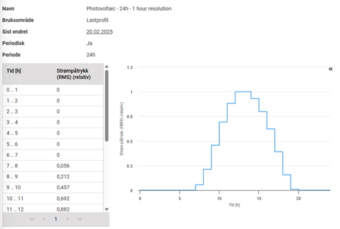 I eksemplet under simuleres det med en lastkurs for solcellepanel, predefiner i Grøft Design®, som gjentas med ett intervall på ett døgn. Denne appliseres på kabel 1, mens kabel to får en statisk/fast last. Eksemplene under viser kun resultat fra kabelen med dynamisk last.