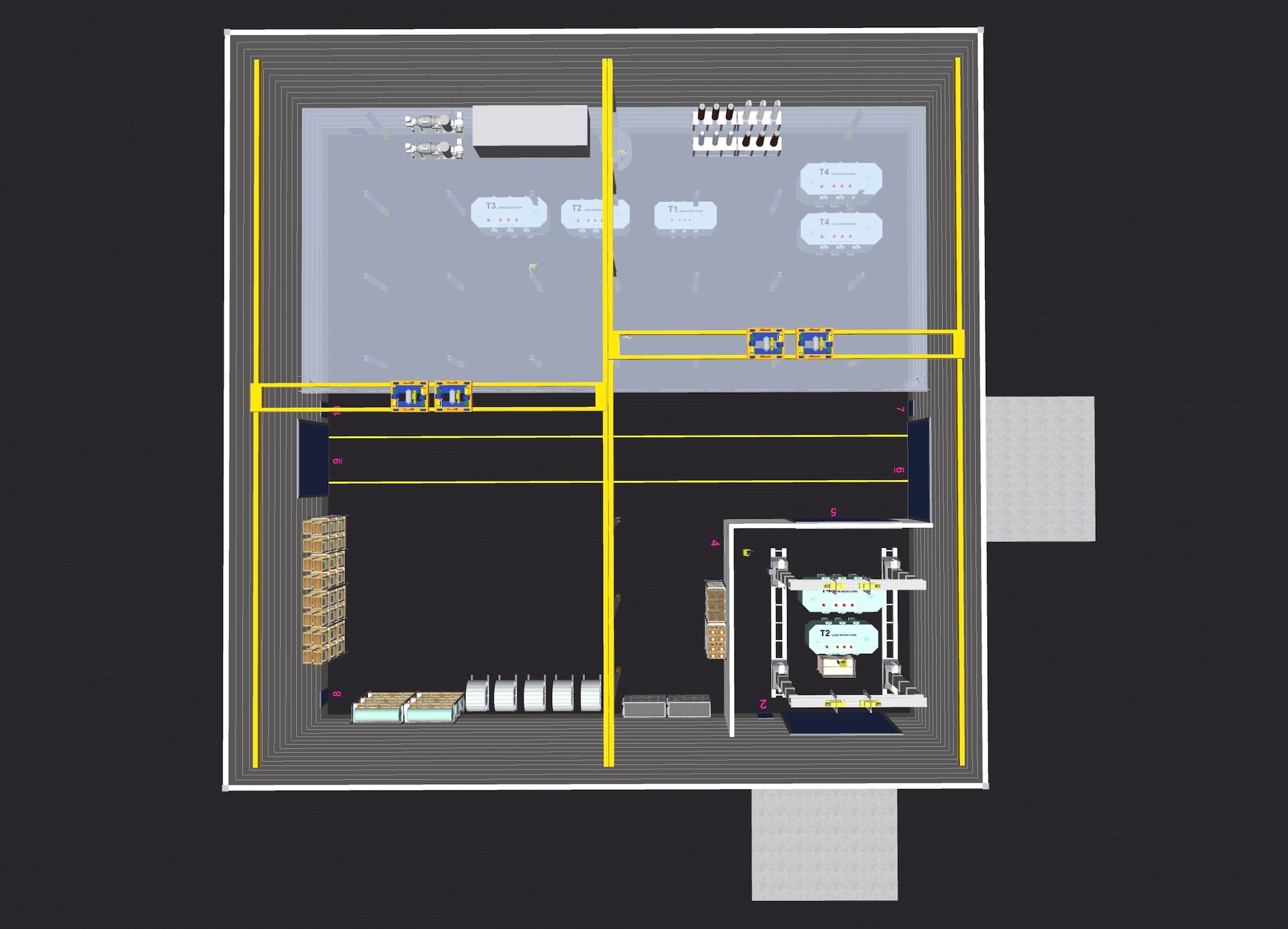 Illustrasjonen viser verkstedet nede til høyre på lageret. Her er det flyttbare vegger og dimensjonert gulv klar til å ta 300 tonns løft. Dette for å kunne løfte ut aktiv del.