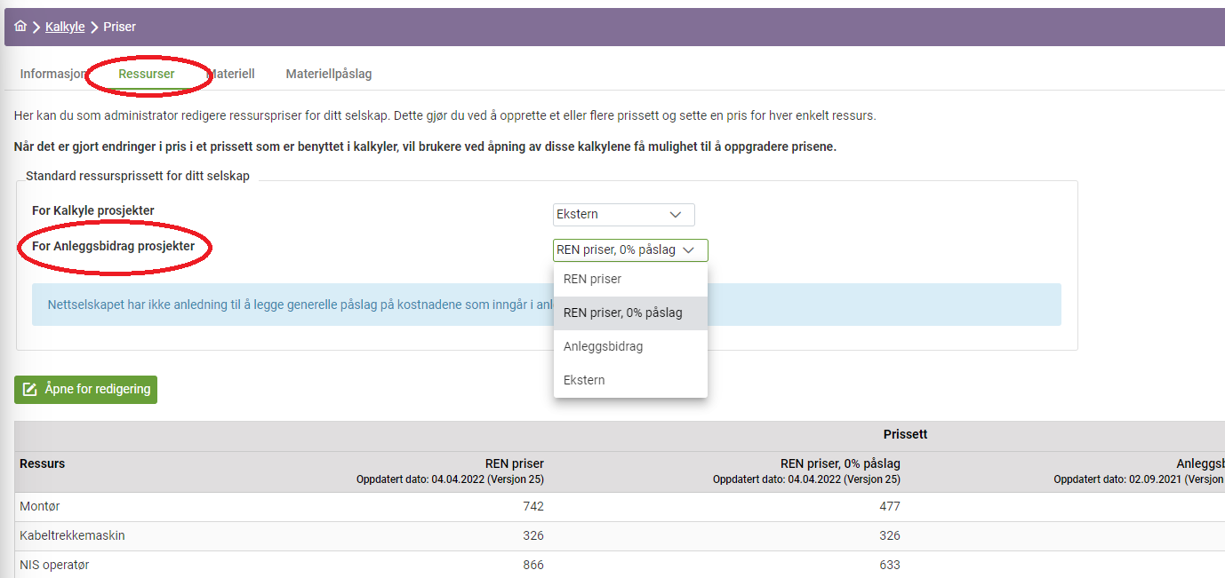 På grunn av retningslinjene og forskriftene fra RME i forhold til bruk av påslag i kalkylene for anleggsbidrag, var det tidligere alltid RENs ressurspris med 0% som ble valgt når en startet en ny kalkyle. Dette er forankret i forskrift om kontroll av nettvirksomhet § 16-6. Anleggskostnad .Det har imidlertid vært ønskelig å kunne styre hva som er standard når en benytter selskapskalkyle. Vi har nå lagt inn funksjonalitet for dette.