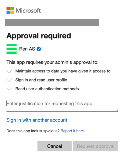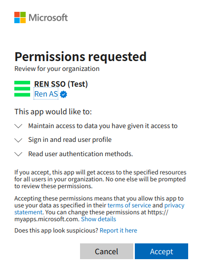 For å kunne bruke Microsoft til SSO hos REN, må REN få tilgang til noe data om brukeren fra Microsoft. Denne tilgangen er det bare administrator hos brukerens selskap som kan gi.