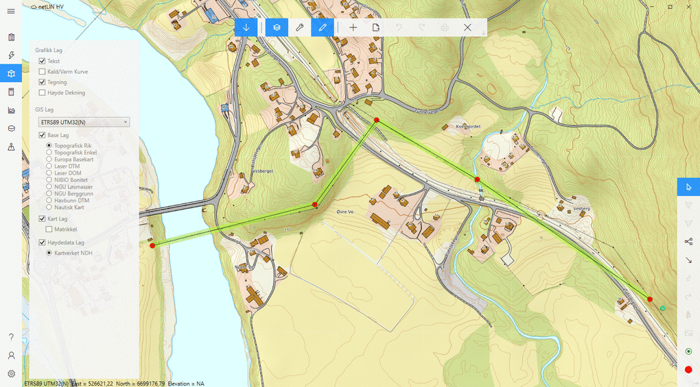I Netlin 4 Plan kan du tegne traséen din direkte i kartet. Programmet utarbeider automatisk en detaljert terrengprofil, som hjelper deg med korrekt stolpeplassering i terrenget.