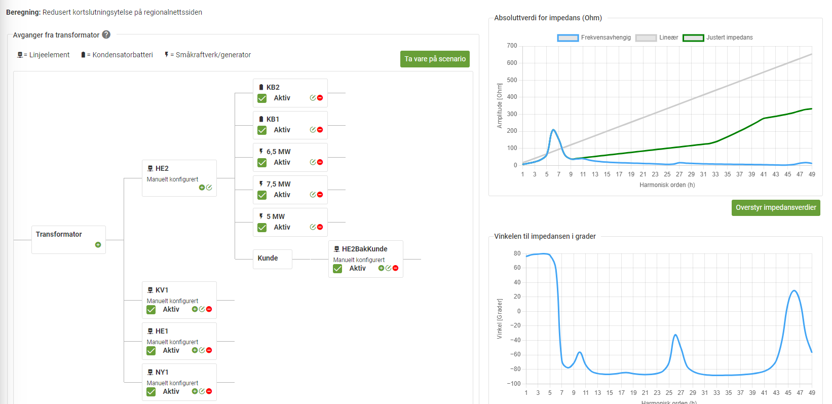 Kalkulatoren beskriver nettets egenskaper ved hjelp av frekvensavhengig impedansberegninger.
